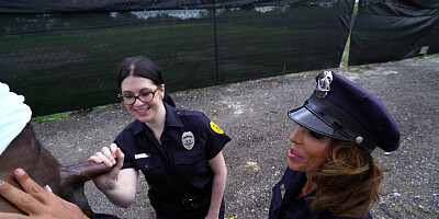 7:08 Cock hungry cops Lyla Lali and Norah Gold sucking giant black pole